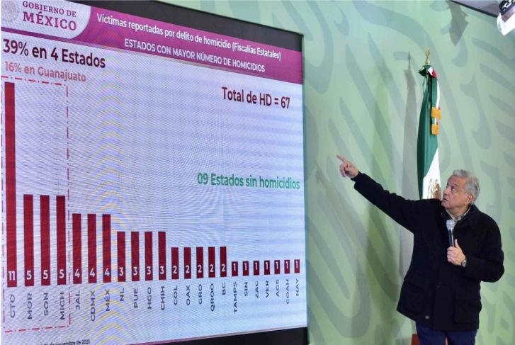 Este jueves –informó– hubo 67 homicidios dolosos en todo el país; Guanajuato está en primer sitio con 11 asesinatos; le sigue Morelos, Sonora y Michoacán con cinco episodios cada uno.