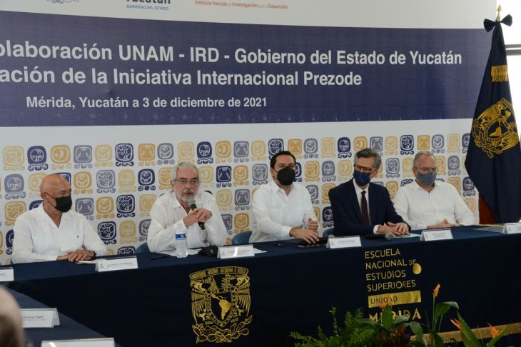El rector Enrique Graue Wiechers signó el documento, junto con el embajador de Francia en México, Jean-Pierre Asvazadourian; y el gobernador del estado de Yucatán, Mauricio Vila Dosal; acompañados por el rector de la Universidad Autónoma de Yucatán, José de Jesús Williams.