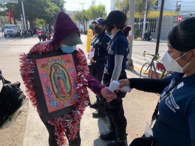 Una y otra vez, integrantes del operativo Basílica, mediante altavoces, sugieren usar el cubrebocas en todo momento.