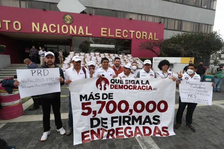 La organización Que siga la Democracia dijo hoy que entregó al Instituto Nacional Electoral (INE) otras 504 cajas con un total de 2 millones 79 mil firmas, en respaldo a la consulta para la revocación de mandato.