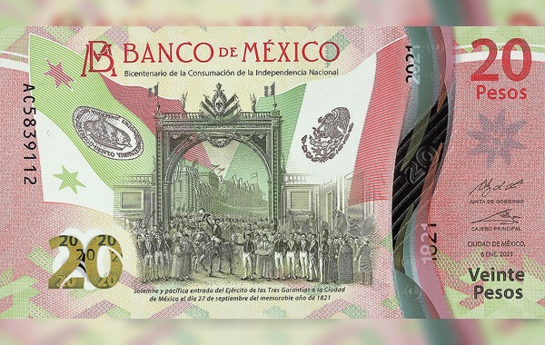 La divisa mexicana tiene en la parte frontal una representación de la entrada triunfal del Ejército de las Tres Garantías a la Ciudad de México y en el reverso está el diseño de la Reserva de la Biósfera Sian Ka’an, en Quintana Roo.