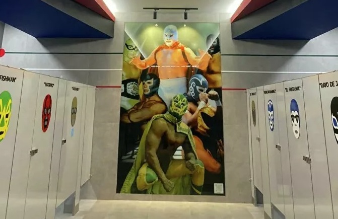 Además, en un video se observa que el Santo y Blue Demon —los dos luchadores más famosos e importantes de México, y también íconos internacionales— ocupan un lugar especial en la entrada a los sanitarios.