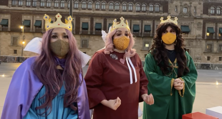 Caracterizadas de manera similar a los Reyes Magos, refirieron a la funcionaria que en las cartas que recibieron este año, las niñas y niños de México no pidieron videojuegos, sino vacunas contra el Covid-19.