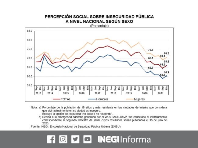 En diciembre de 2021, 70.3 por ciento de las mujeres tuvo una percepción de inseguridad, superior al 65.8 por ciento que registró el trimestre previo, mientras que 60.2 por ciento de los hombres lo percibió así, luego de que 58.8 por ciento se reportó en el periodo julio-septiembre del año pasado.