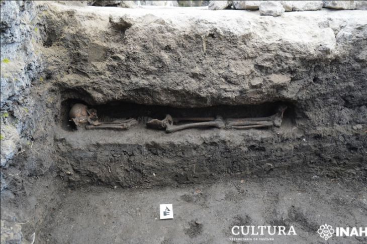 Por otro lado, el entierro corresponde a una persona adulta, de entre 18 y 25 años, y destaca la combinación de la usanza española e indígena porque el cuerpo fue depositado en una fosa en posición cristiana, pero fue colocado debajo de uno de los acueductos, costumbre funeraria de la tradición mesoamericana.