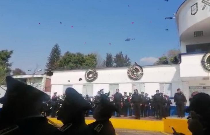 Decenas de coronas y arreglos florales, el sobrevuelo de un helicóptero del Agrupamiento Cóndores, que arrojó pétalos de rosas, las sirenas de patrullas y la banda de guerra fueron parte de la ceremonia luctuosa y del cortejo fúnebre.