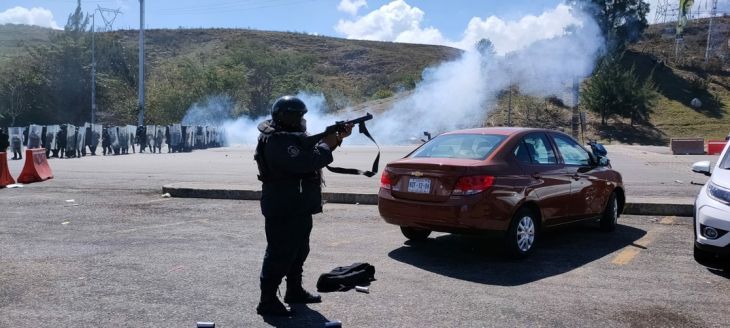 El enfrentamiento inició cuando los efectivos de la Guardia Nacional revisaron por la fuerza los 10 camiones en los que se trasladaron los estudiantes, que empezaron a lanzar petardos, bombas Molotov, y piedras, en tanto que los uniformados respondieron disparando gases lacrimógenos.