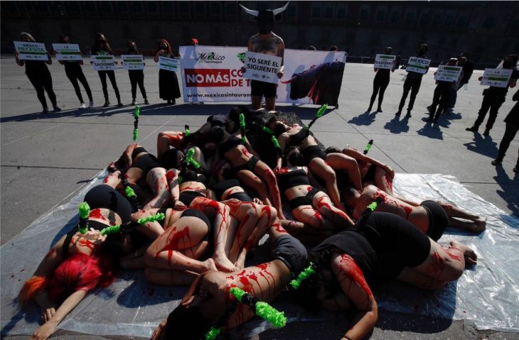 Con un performance, donde los cuerpos de varias mujeres yacían en el suelo ensangrentados y con banderillas en sus cuerpos, integrantes de la asociación Animal Heroes llamaron al Congreso de la Ciudad de México a prohibir la tauromaquia, como lo han hecho ya otras cuatro entidades, al representar un acto cruel y de violencia contra los toros.