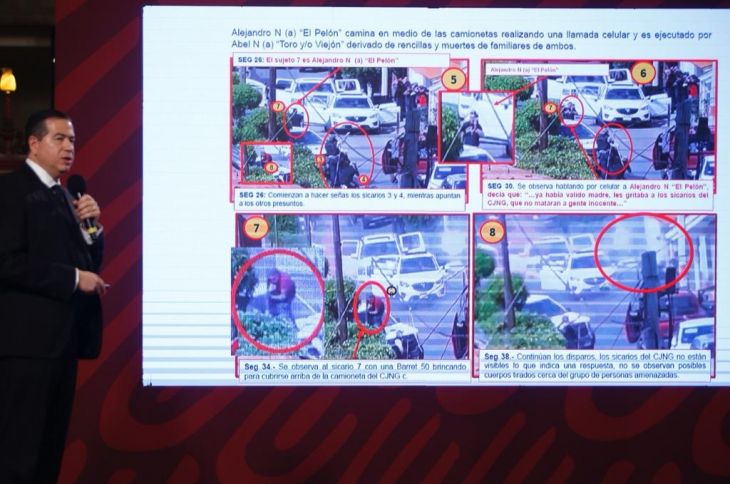 La secretaria de Seguridad Pública y Ciudadana, Rosa Icela Rodríguez, y el subsecretario del ramo, Ricardo Mejía Berdeja, con objeto de exponer la investigación -hasta el momento de la refriega en el poblado michoacano-, el mandatario reprobó la actitud de personajes, como el expresidente Felipe Calderón Hinojosa: es un “cinicazo, estamos esperando que explique por qué tenía de brazo derecho a Genaro García Luna, por qué lo nombró como secretario de Seguridad. ¡Se atreve a opinar!”.
