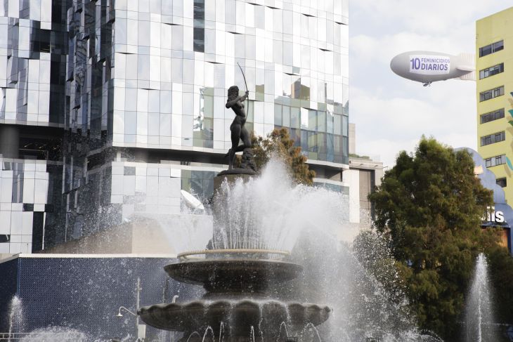 En el marco del Día Internacional de la Mujer, un zepelín de 50 metros avanzó por cinco puntos emblemáticos de la Ciudad de México: la Fuente de la Diana, la Victoria Alada (Ángel de la Independencia), el Senado de la República, el Monumento a la Revolución y Bellas Artes.