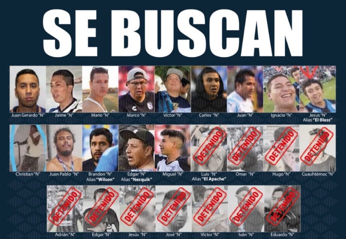 "A estas personas, se les busca, pues el Juez de Control del Poder Judicial, ha otorgado órdenes de aprehensión por los delitos de homicidio en grado de tentativa, violencia en eventos deportivos y apología del delito", se lee en el texto.