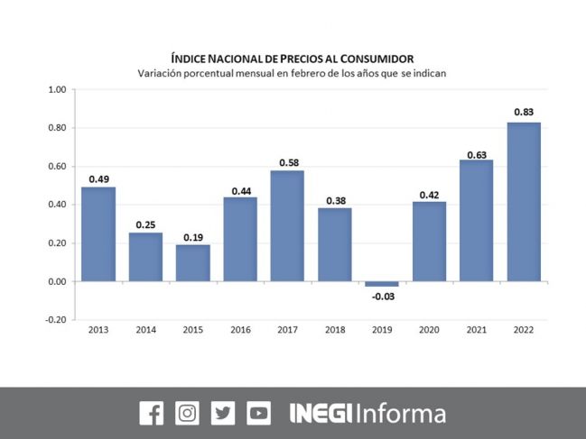 De acuerdo con el Inegi, el Índice Nacional de Precios al Consumidor (INPC) registró una variación de 0.83 por ciento en febrero respecto al mes anterior, cuando se ubicó en 0.59 por ciento. Con este resultado, la inflación general anual se ubicó en 7.28 por ciento, luego de que en enero fue de 7.07 por ciento.