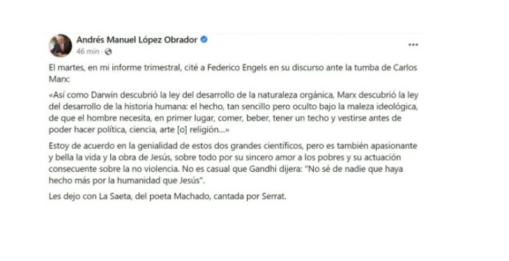 Después de citar a Federico Engels y a Darwin, el presidente Andrés Manuel López Obrador se refirió a la figura de Jesús, en particular por su amor a los pobres y su actuación consecuente a la no violencia.
