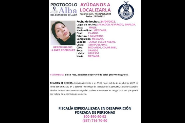 La joven, originaria de Guamúchil, desapareció el pasado domingo 24 de abril al salir de su casa, en la colonia 10 de mayo. Por eso, sus familiares reportaron su ausencia al día siguiente a las autoridades de la Fiscalía General de Justicia zona norte.