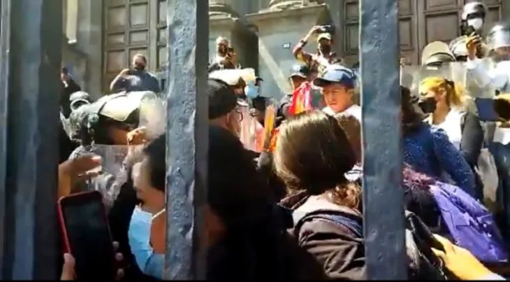La policía antimotines, que en principio estaba resguardando la entrada principal de la catedral, decidió avanzar unos metros para impedir que la protesta llegara hasta el acceso al recinto.