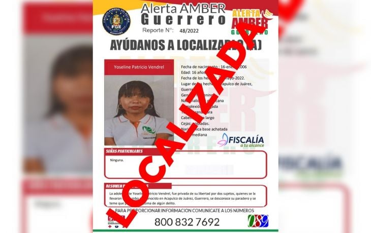 La joven Yoseline Patricio Verdel, de 16 años de edad, quien se encontraba desaparecida desde el pasado viernes, fue localizada con vida en las inmediaciones de la colonia San Agustín, en el puerto de Acapulco, Guerrero.
