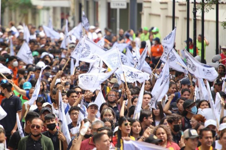 La marcha partió minutos después de las 11 de la mañana, encabezada por Raúl Padilla, a quien el gobierno ha señalado de “mantener secuestrada a la universidad”, así como por el rector Villanueva y el vicerrector Héctor Solís Gadea.