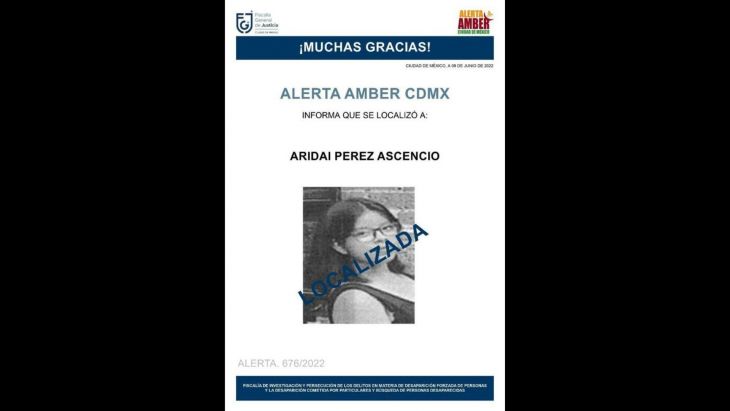 Personal de la Fiscalía General de Justicia de la Ciudad de México localizó a salvo a Aridai Pérez Ascencio, quien fue reportada como ausente luego de ser vista por última vez el pasado 2 de junio en la colonia San Lucas Xochimanca, alcaldía Xochimilco.