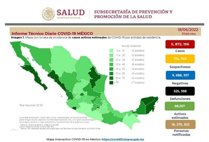 La Secretaría de Salud (Ssa) reportó hoy un incremento de 9 mil 642 casos confirmados de Covid-19, con lo que suman 5 millones 872 mil 196 contagios, mientras que los decesos se elevaron en 39, para un acumulado de 325 mil 398.
