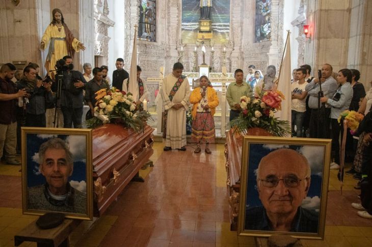 Esta tarde se realizaba el funeral en la parroquia San Francisco Javier, después de una misa de cuerpo presente oficiada por el obispo de la Diócesis Tarahumara, Juan Manuel González Sandoval, y por el provincial de la Compañía de Jesús, Luis Gerardo Moro Madrid, a la cual acudieron la gobernadora de Chihuahua, María Eugenia Campos Galván, y la secretaria de Bienestar, Ariadna Montiel Reyes, en representación del presidente López Obrador.