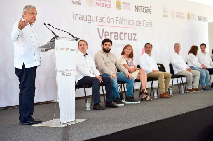 Al inaugurar una nueva fábrica de Nestlé en Veracruz, señaló que esa trasnacional no ha abandonado al país y México no va a dejar de apoyarla. Esto pese a que recientemente los cafeticultores pidieron al mandatario en un desplegado, dejar de respaldar a dicha empresa.