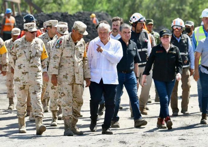López Obrador fue recibido en la mina por el gobernador Miguel Angel Riquelme y representantes del Ejército Mexicano que tienen en marcha el Plan DN-III y supervisan el funcionamiento de las bombas de extracción y los niveles de inundación en el socavón.