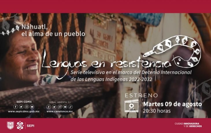 Con la finalidad de visibilizar la diversidad lingüística y cultural de la Ciudad de México, y en el contexto del Día Internacional de las Lenguas Indígenas, la Secretaría de Pueblos y Barrios Originarios y Comunidades Indígenas Residentes, en colaboración con el Canal Once se estrenará este 9 de agosto la serie documental Lenguas en resistencia, que narra historias de exclusión o discriminación en voz de jóvenes promotores, cineastas y escritores, quienes están formando un movimiento de reivindicación de su lengua y cultura.