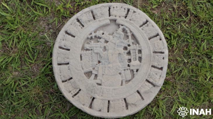 El disco de piedra, hallado en 2021 en el Templo del Sol, está hecho de piedra caliza y mide 45 centímetros de diámetro y 9 centímetros de grosor. La pieza representa al joven dios del maíz sentado en un trono portando un faldellín de cuentas de jade y un tocado máscara de serpiente.