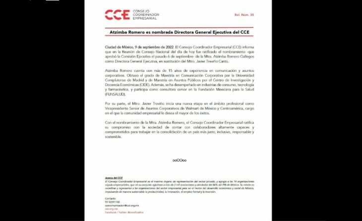 El organismo cúpula señaló que la nueva directora general ejecutiva tiene estudios de maestría en comunicación corporativa por la Universidad Complutense de Madrid y de maestría en asuntos públicos por el Centro de Investigación y Docencia Económicas (CIDE).