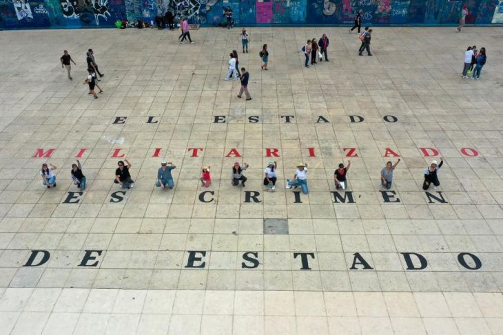 “Fue el Ejército”, escribieron con letras grandes y en color blanco en el pavimento de Paseo de la Reforma, alrededor de la ex Glorieta a Colón. Mensaje que fue acompañado con el nombre de varias víctimas que han sido asesinadas o desaparecidas presuntamente por militares. También, en la explanada del Monumento a la Revolución, pintaron en rojo y negro la leyenda: “El Estado militarizado es crimen de Estado”.
