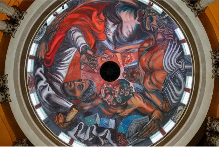 El hombre creador y rebelde, que corona la cúpula del paraninfo de la Universidad de Guadalajara y fue pintada por José Clemente Orozco, sufrió 10 fisuras leves por el temblor del pasado 19 de septiembre, lo que requerirá el apoyo de profesionales de restauración del Instituto Nacional de Bellas Artes y Literatura.