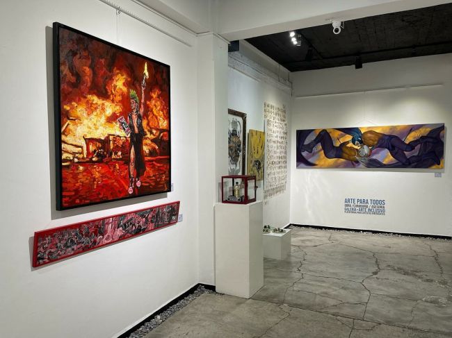 Israel Alvarado, director de la galería, fue el encargado de la curaduría para la obra de 34 artistas contemporáneos nacionales y extranjeros. Los temas más frecuentes, indicó Aguafuerte, son la corrupción, la violencia heteropatriarcal, la pobreza y la injusticia.