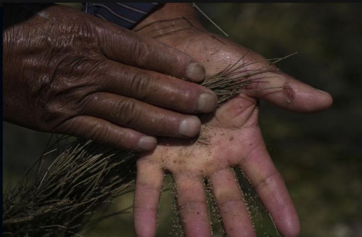 “La limpia lleva un proceso muy laborioso”, dijo el agricultor mientras frotaba con sus manos una rama de pino para retirarle los huevecillos y depositarlos sobre una manta rosada.