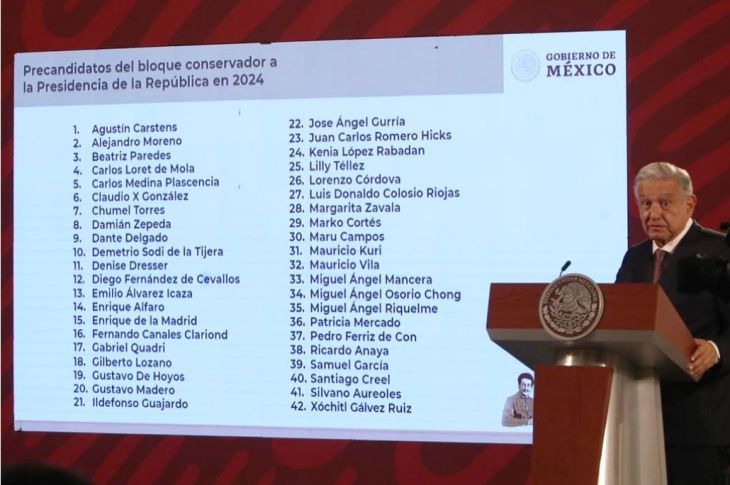 Como lo adelantó hace un par de días, hoy el mandatario federal dio a conocer a estos personajes porque “son los que han expresado que quieren, han aparecido en encuestas o los han propuesto, para que vean cuántos hay del bloque conservador. De una vez vamos a destapar”.