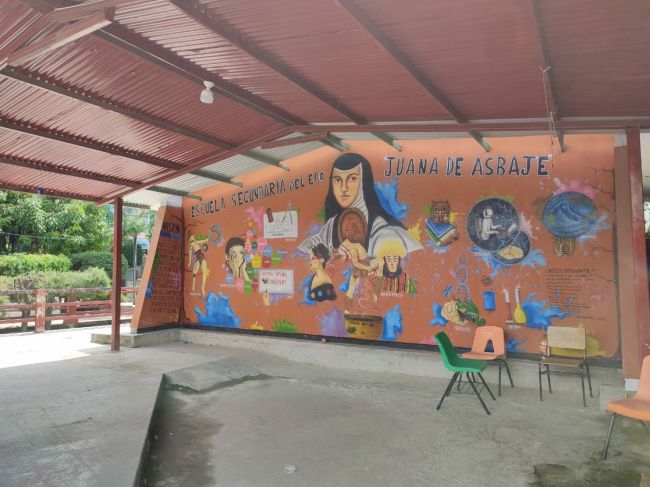 La escuela Juana de Asbaje, ubicada en el centro de Bochil, permanecía cerrada este lunes luego de haber suspendido actividades el 7 de octubre, pero una comisión de funcionarios ingresó para observar sus condiciones. En los salones de clases encontraron botes de basura que aparentemente no fueron revisados por elementos ministeriales.