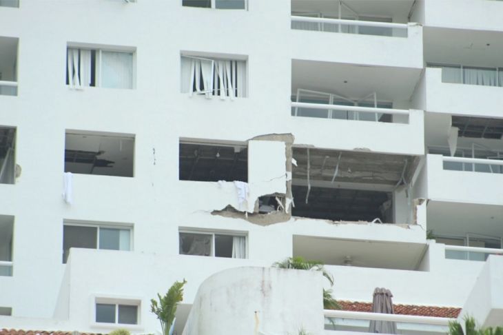 Desde la avenida Escénica se observan daños en al menos dos departamentos o estancias, en dos pisos del conjunto habitacional, mientras que sobre la vialidad hay vidrios que fueron lanzados por la explosión.