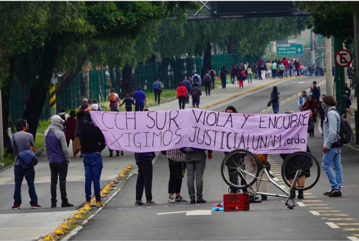 Los jóvenes, que previamente habían tomado la dirección de la facultad, se colocaron sobre el carril dirección sur-norte, enarbolando una manta con la frase “CCH Sur viola y encubre. Exigimos justicia”.