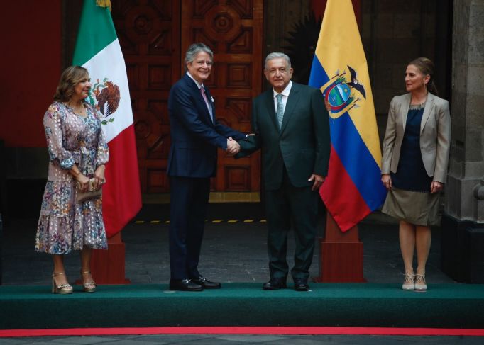 El mandatario mexicano recibió al ecuatoriano en una de las puertas de Palacio Nacional. Ambos estuvieron acompañados de sus parejas Beatriz Gutiérrez y María de Lourdes Alcívar.