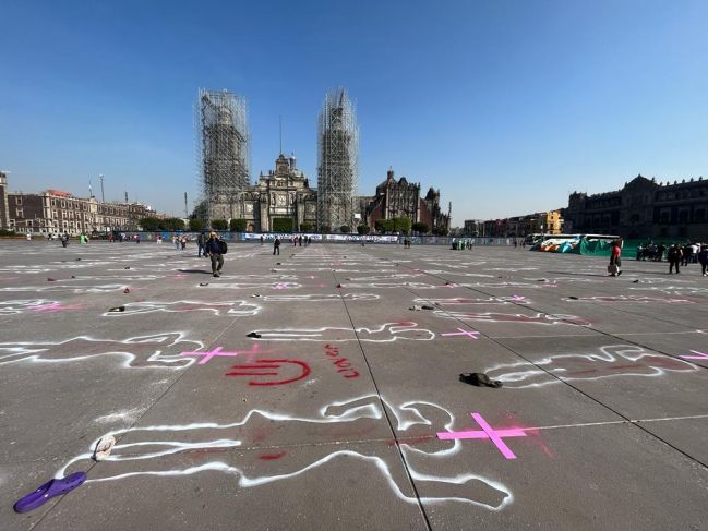 En esa zona sólo hay vallas pequeñas y tras ellas se encuentran policías. En el suelo de la explanada están pintadas siluetas de mujeres que representan a víctimas de feminicidios.