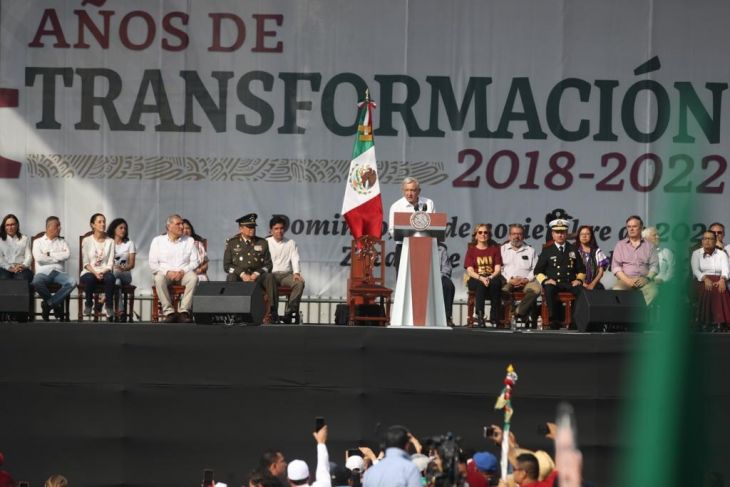 Tras una larga jornada a pie, el presidente Andrés Manuel López Obrador finalmente llegó al Zócalo de la Ciudad de México donde inició su discurso, por el Cuatro Informe de Gobierno, dedicando el acto aquellos que lucharon por la democracia y hoy ya no están. Y expresó que “estamos reduciendo la violencia” y a hacer realidad el Humanismo Mexicano.