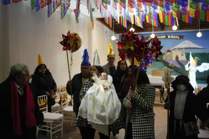 No se puede exponer a la luz solar, al flash de las cámaras o a la humedad, explica Abraham Cruz, cuya familia organizó la sexta posada de esta temporada invernal. A sus espaldas, en lo que parece ser la cochera de la vivienda, el Niñopa luce sonriente y tranquilo desde una suerte de altar casero mientras inicia la procesión.