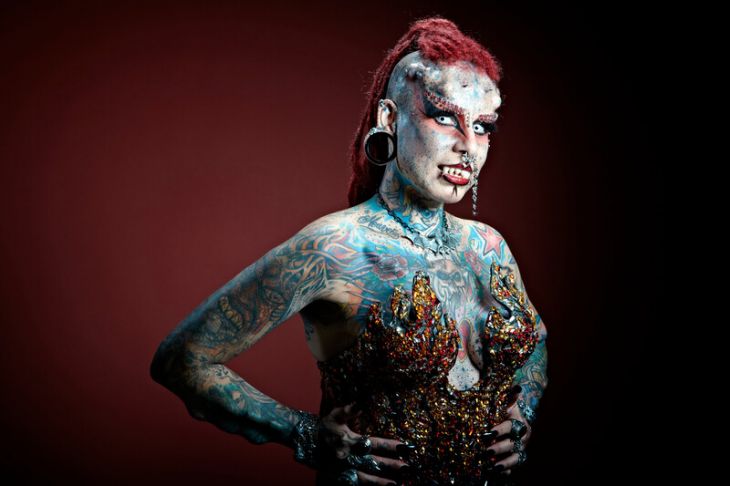 La Mujer Vampiro tiene implantes transdérmicos en la frente, el pecho y los brazos. Entre las múltiples perforaciones que tiene destacan la de los labios, la ceja, la nariz, la lengua, el ombligo y los pezones.