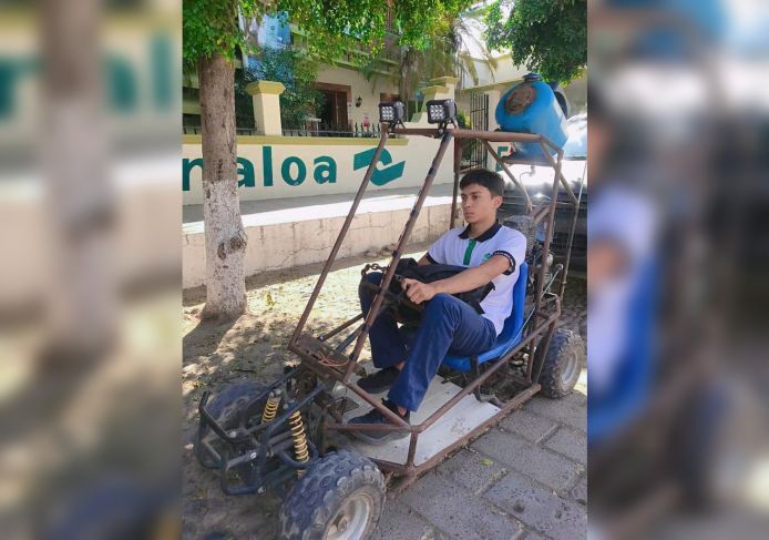 Usando las partes de una cuatrimoto y una motoneta viejas así como pedazos de una lavadoras y otros fierros que él mismo ensambló, Rosvel Emir logró culminar un vehículo de motor con el que llega a su escuela, el Conalep El Fuerte, en Sinaloa.