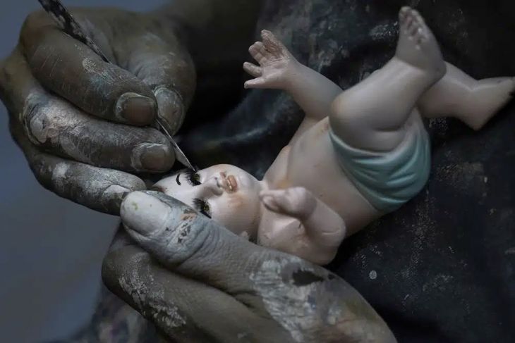 Maximino ha terminado los ojos del niño de María y ahora se concentra en las cejas. Tan pronto se seque la pintura, la estatuilla que está en sus manos podrá volver a casa como un bebé sano, sonriente y cachetón.