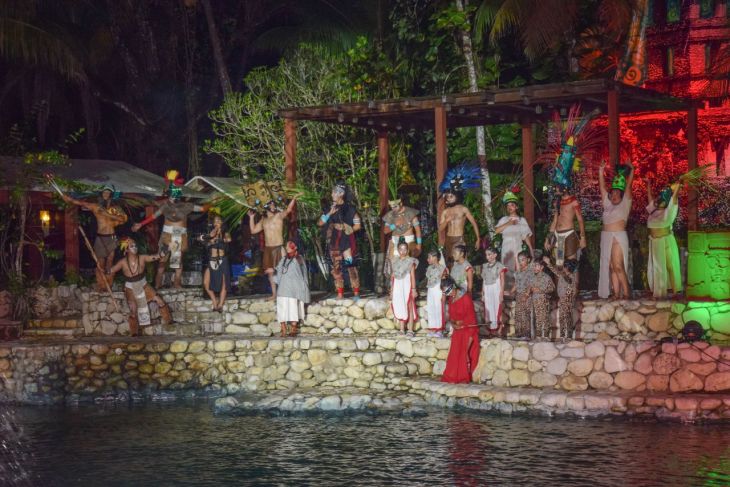 También destacaron los actos acuáticos que incluyeron a pequeñas bailarinas de entre cuatro y ocho años, que dentro del agua eran cargadas sobre los hombros de algunos jóvenes. Tras este acto, los participantes realizaron distintas poses en islas de piedra en medio de la alberca y otro donde los danzantes interpretaron a guerreros mayas con arcos y flechas.