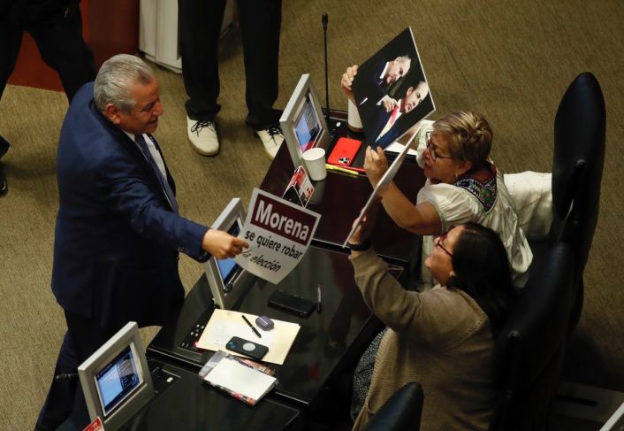 Al frente de los escaños de Morena se colocaron carteles con el logo del PAN junto a la imagen de García Luna. Los guindas colocaron además en el patio y dentro del salón de sesiones mantas enormes con los mensajes: “El INE no se toca. García Luna no se toca. Calderón no se toca. Fox no se toca. Lorenzo no se toca”. Y como remate: “La marcha de la corrupción, la marcha de la impunidad”.