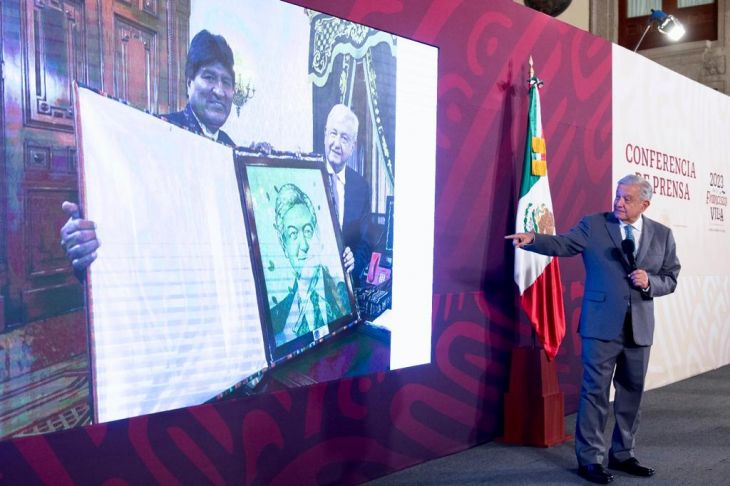 Durante la conferencia de prensa de este martes el presidente Andrés Manuel López Obrador presentó un retrato que le regaló el ex presidente boliviano Evo Morales, hecho en su totalidad con hoja de coca.