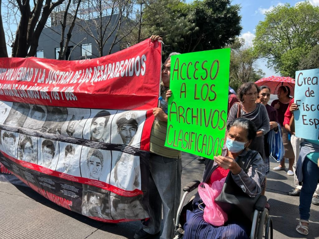 Mostrando una manta con las fotografías impresas de las personas desaparecidas y cartulinas demandando la apertura de los archivos clasificados con objeto de deslindar responsabilidades y sobre todo, conocer el destino de sus familiares.