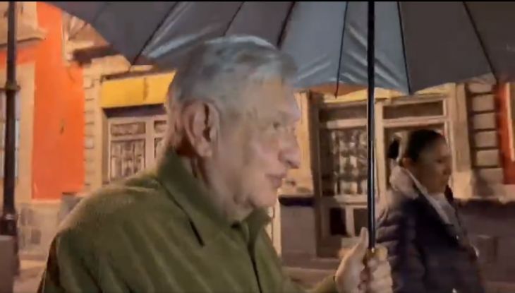 Con paraguas en mano para resguardarse de la fuerte lluvia cae esta noche sobre el centro de la Ciudad de México, el mandatario caminó a un costado del Templo Mayor para llegar al restaurante.