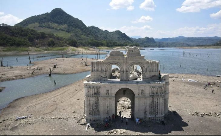 Una iglesia colonial que estaba sumergida en las aguas de un embalse en el sur de México quedó al descubierto por la sequía y las altas temperaturas que azotan al país.